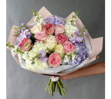 This bouquet is made with fresh flowers and love. Handcrafted by our florists, this stunning bouquet is ready to impress. The bouquet may vary slightly in color as on the foto. It depends on the variety of roses and flowers available.